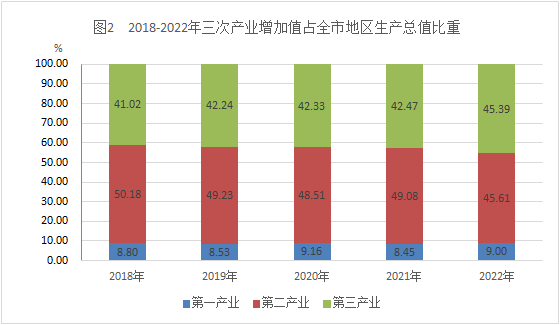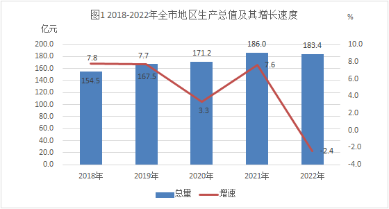 2022年,全市实现地区生产总值(GDP)183.4亿元,同比下降(以下简称下降)2.4%。其中:第一产业实现增加值16.5亿元,(以下简称增长)增长5.1%;第二产业实现增加值83.7亿元,下降8.2%;第三产业实现增加值83.2亿元,增长2.4%。三次产业结构为9.0:45.6:45.4。