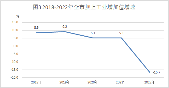 全年全部工业实现增加值55.5亿元,下降14.3%,其中:规模以上工业增加值增速-16.7%。