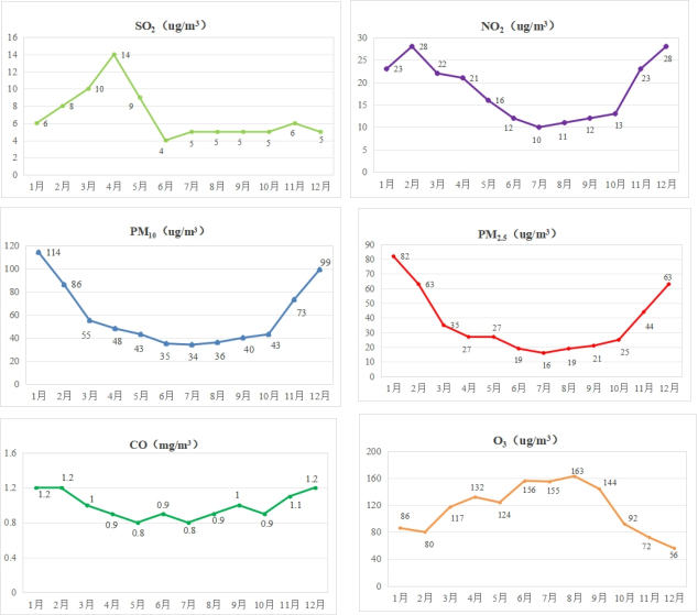 按照《环境空气质量标准》(GB3095—2012)评价,2023年SO2、NO2、CO、O3、PM10浓度低于二级标准,细颗粒物的年均浓度超标4.6%。时间分布上,受冬季不利污染物扩散气象条件的影响,2023年12月至次年2月,颗粒物的浓度较高,次年1月份PM2.5月均浓度达到极值(82μg/m3)。