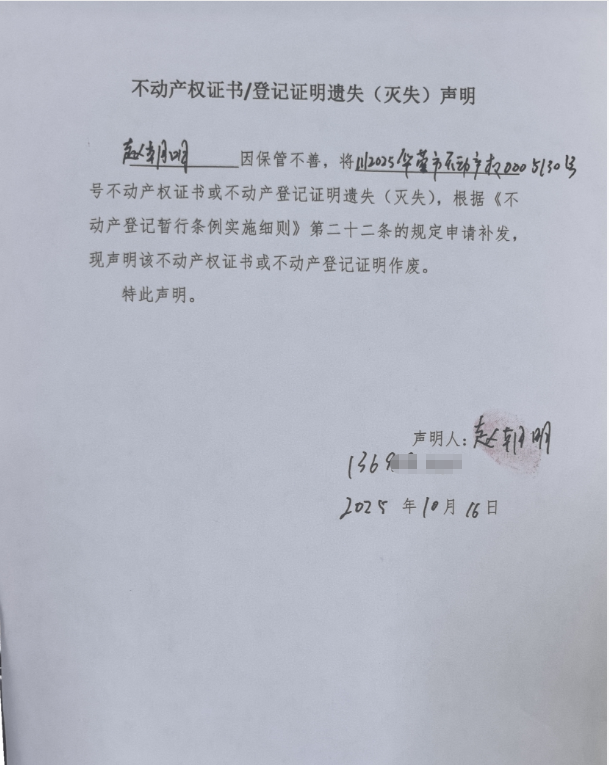 不动产权证书/登记证明遗失(灭失)声明(赵朝明)