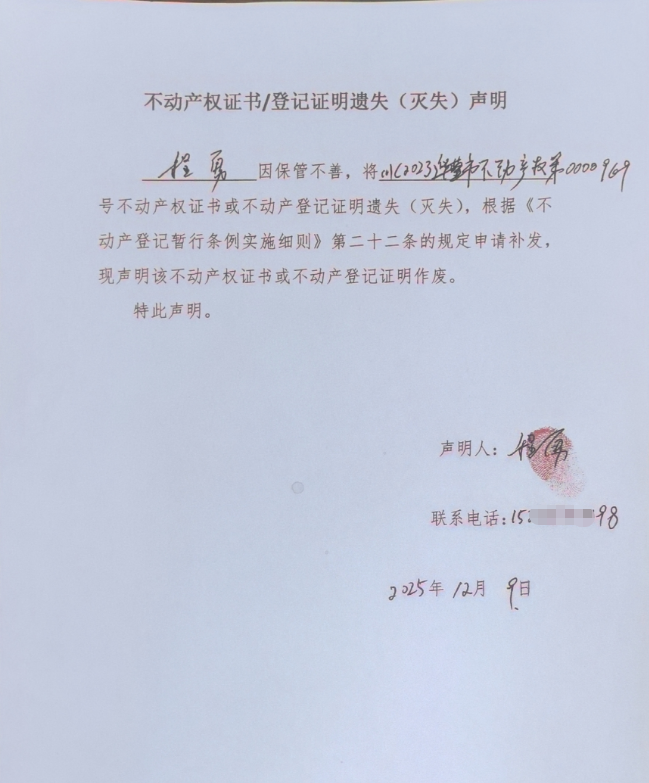 不动产权证书/登记证明遗失(灭失)声明(程勇)