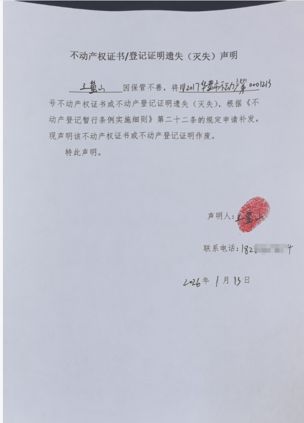不动产权证书/登记证明遗失(灭失)声明(王蓥山)