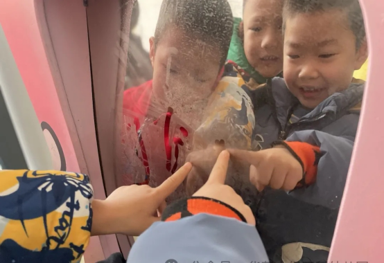 通过有趣的哈气活动,孩子们发现呼出的气体会出现白雾形成小水珠。原来是因为人体呼出的气体含有水蒸气,水蒸气是看不见、摸不着的。在低温环境下,呼出的气体体温较高,水蒸气遇到寒冷的空气就会降低温度,形成小水滴悬浮在空气中,也就是我们看到的“白雾”。