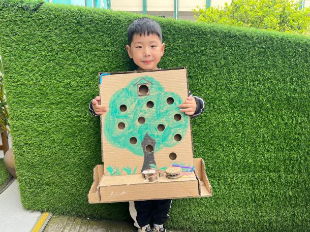 “旧纸箱可以变成小玩具!”“塑料瓶能种花!”在手工环节,孩子们和老师一起将废旧材料“大变身”。纸杯做成的盆栽、瓶盖拼贴的环保画、旧报纸折叠的小篮子......孩子们在动手实践中感受到“垃圾是放错地方的宝藏”。中班的小朋友举着自己的小植物开心地说:“我要把这个小植物送给地球妈妈!”