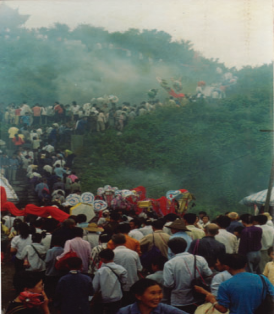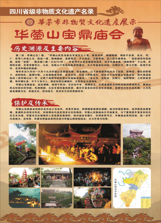 华蓥山宝鼎庙会,于每年农历六月初一至六月十九举行,六月十九日夜达到高潮。开始时,由各地香头神首募集资金,购买物资,挑选童男童女,进行排练,筹办庙会。庙会期间,各地民间艺人、戏曲班社随香客来此起会,表演各种民间文艺。其中,以香客们在六月十九日晚送诸神归山的“送驾”游行仪式极具观赏性和研究价值。各送驾队伍分别以云童在前面替“圣驾”(用竹编或木雕做成五层或八层的彩色塔形楼阁)开道,青狮白象、八仙过海等造型紧随其后。云童分文童和武童,托云盘或香盘的为文童,擎灯笼者为武童。云童随锣鼓点子起舞,变幻步伐、舞姿及造型。文、武童表演时,另有若干手执彩色云牌的童子“护驾”,起着烘托陪衬作用。这一表演形式称为“跳云童”。跳云童的舞姿造型复杂多变,如“狮子滚绣球”、“苏秦背剑”等,现已收集到三十余式(1956年,根据跳云童改编成民间舞蹈的“云童舞”,曾参加全国民间音乐舞蹈汇演,获优秀奖)。“圣驾”后随抬盒,抬盒内盛放着香、花、灯、水、果、茶、食、宝、珠、衣,俗称“十供养”(即十神供品)。其后是龙狮队。龙、狮随锣鼓、唢呐声边走边舞。行进式表演,送驾队伍路上但凡遇桥梁、土地、寺庙,都要停下祭拜。送驾队伍到宝鼎后先在庙前朝圣,再进殿上贡敬香,参拜祈祷。各地抬上山的“圣驾”则集中在一处,待子时到来时,点火焚烧,送诸神归天,送驾即告结束。
