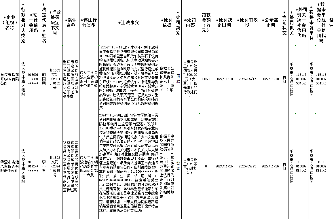 华蓥市交通运输局行政处罚公示法人-11月28日
