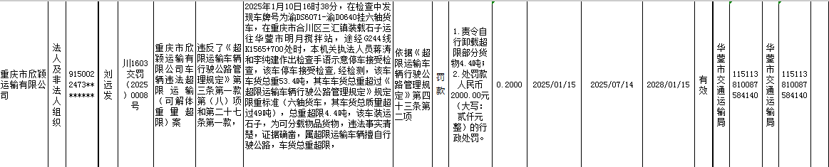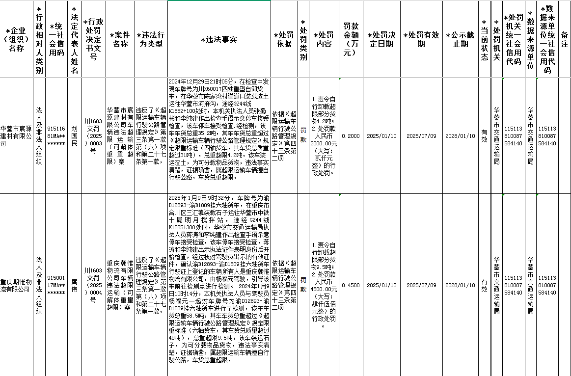 华蓥市交通运输局行政处罚公示法人-1月16日