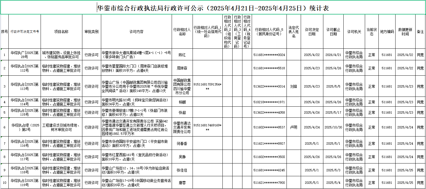华蓥市综合行政执法局行政许可公示(2025年4月21日-2025年4月25日)统计表