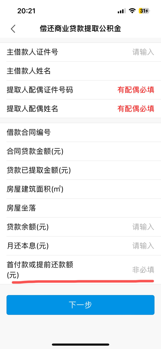 登录手机公积金APP点击业务办理偿还公积金贷款本息提取,在当年提前还款额栏输入提前还款金额,然后上传相关资料(注:提前还款凭证可上传到任意资料栏)。如显示未查询到贷款信息,提取人需带上身份证、银行卡、结婚证、含还款金额的提前还款凭证到现场办理。